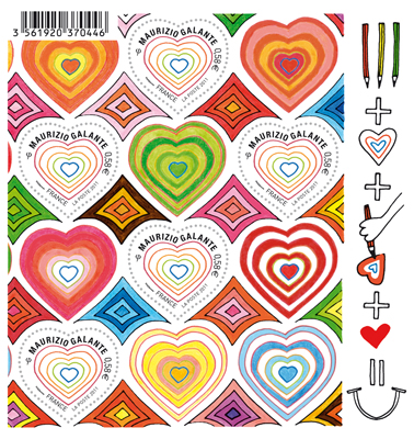 Les 2 timbres coeurs conçu par Galante sont disponibles en feuilles autocollantes de 30, à la fois sur la boutique du timbre et la boutique pro.